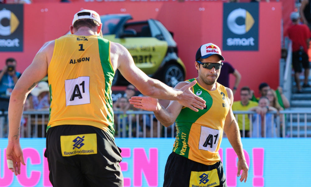 Alison e Bruno Schmidt superaram os letões Plavins e Regza por 2 sets a 0 (21/19, 21/19), em 41 minutos. A parceria decidirá o primeiro lugar da chave E contra os chilenos Marco e Esteban Grimalt.
